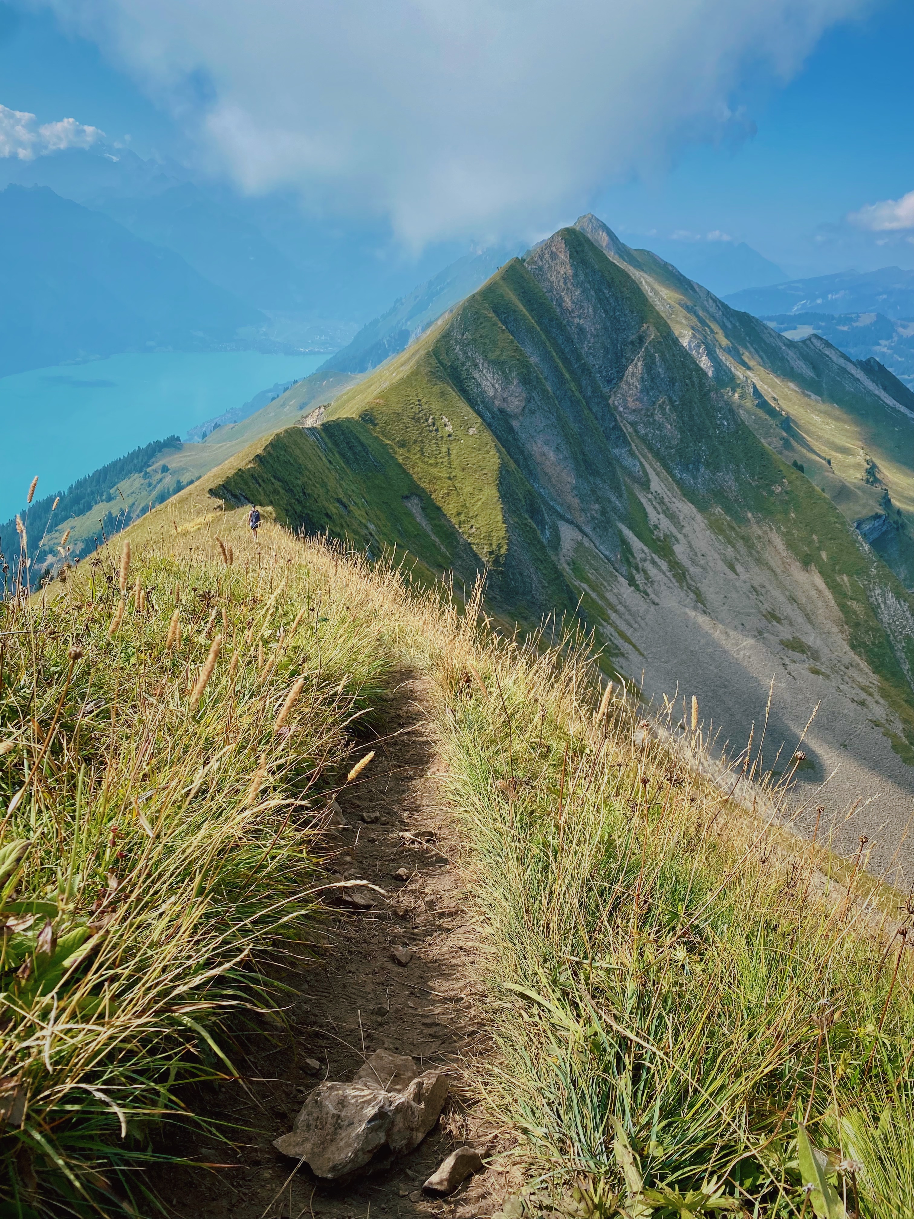 We started early with the 7:30 a.m. cogwheel train from Brienz to Brienzer Rothorn. After a quick coffee and a croissant at the hotel to warm up, it was go time. It took us a little under six hours of hiking time and almost 23 km to get to Harder Kulm. I was mentally prepared for a long day, but damn that last hour after we started descending the ridge felt like ten. My feet were dead. I was worried that if I sat down, that would be it.